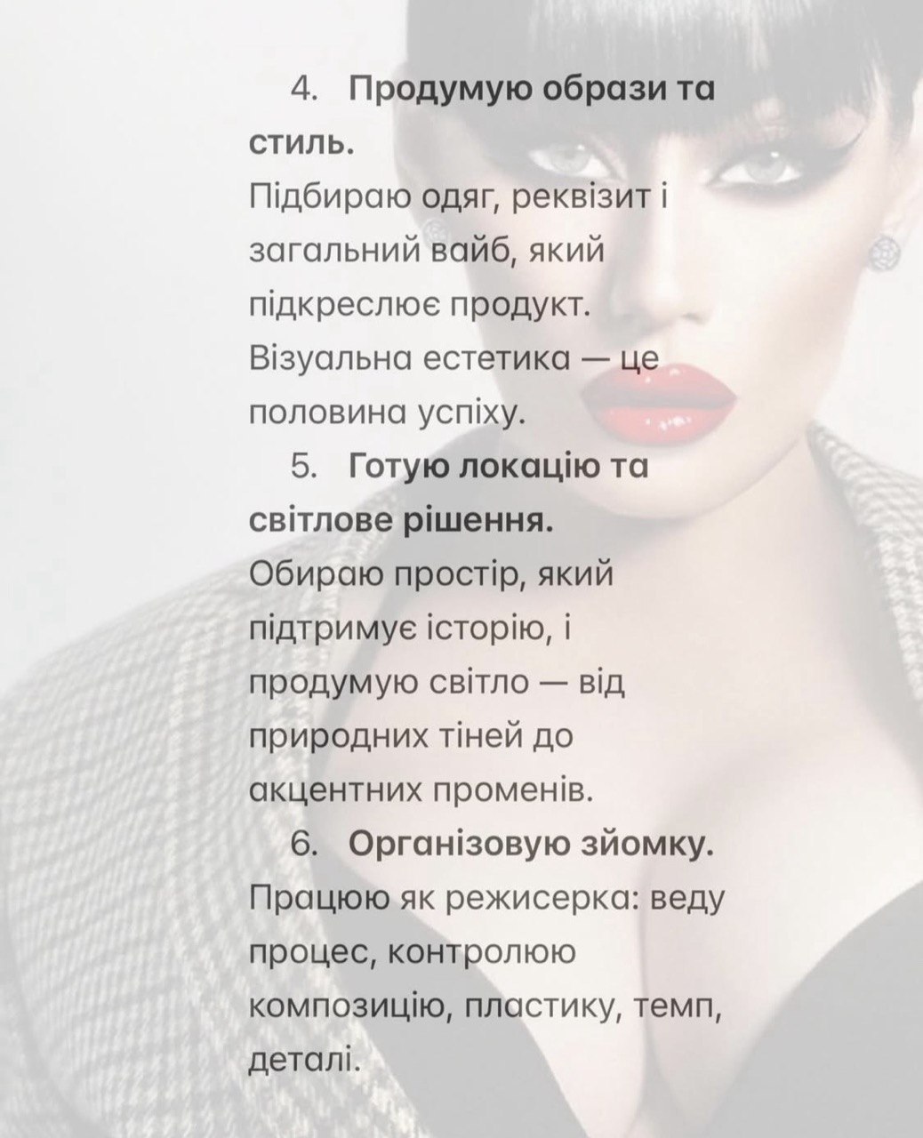 Я фешн - фотографиня & модель. Обожнюю бути по той бік камери і по цей. Я - жива концепція!